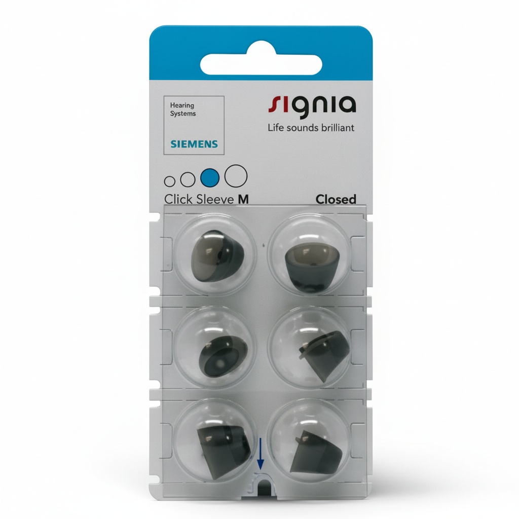 Signia Click Sleeves are domes for hearing aids that can be used with several of Signia’s hearing aids, such as Signia Silk, as well as regular in-the-ear receiver hearing aids. For Signia’s small Silk hearing aids, which are almost invisible inside the ear, the dome is placed on the hearing aid, ensuring a perfect fit for the ear canal. Furthermore, the anti-slip effect ensures that the hearing aids stay in the ear at all times. There are several versions of Signia Click Sleeves to choose from, including both an open and ventilated version.