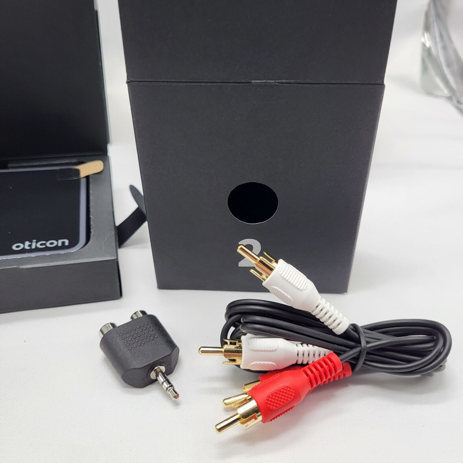 The Oticon TV Adapter Cable Kit, included in the original box 2, comes with an RCA cable and a minijack adapter. While Oticon recommends using the TOSLINK cable for the best audio experience, this kit provides flexible connection options for your TV Adapter. The RCA cable connects to the “L-R AUDIO OUT” ports on your TV, while the minijack adapter allows connection via the headphone jack. Ideal for those needing alternative connection methods.