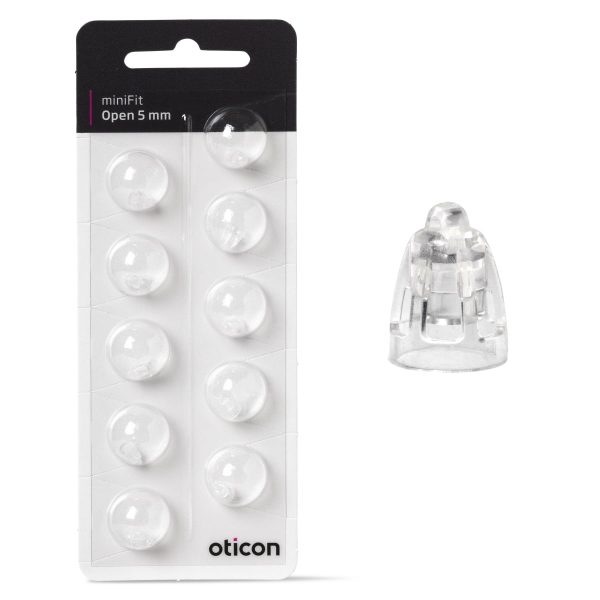 The Oticon miniFit Open 5 mm domes are made of soft, skin-friendly material that adapts to your ears. There are 3 different versions of miniFit domes that you can easily switch between. Here, the open version is shown, which provides the least amount of occlusion in the ear canal but also gives less dynamic in the amplified sound. MiniFit domes should be changed at least once a month and more frequently as needed.