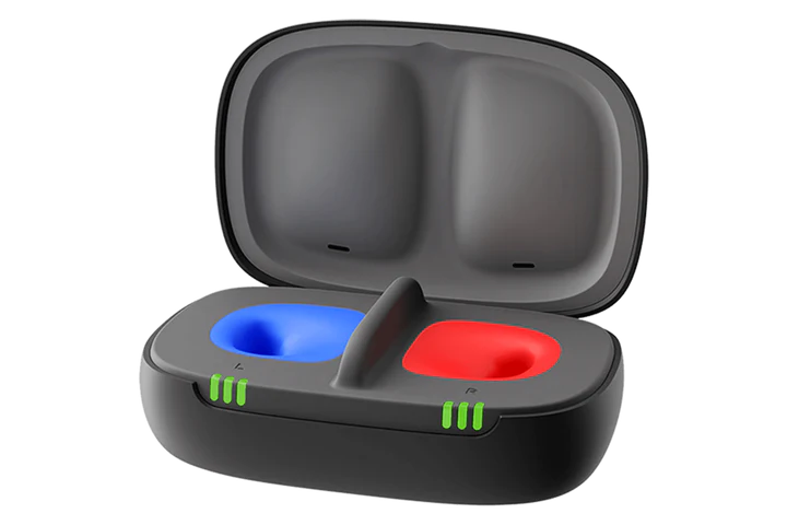 The charger is designed to be user-friendly and intuitive, with clearly marked left and right slots (red = right, blue = left) for easy placement of your hearing aids. LED indicators display the charging status—when three green bars light up, your hearing aids are fully charged. The hearing aids automatically turn off when placed in the charger and turn on again when removed.