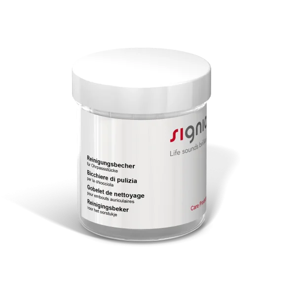 Begin by placing a Signia Cleaning Tablet in the cup, and then fill it two-thirds full with warm water. Next, add the earmoulds to the cup and let them soak for 30 minutes. Afterwards, carefully remove the earmoulds and rinse them thoroughly with lukewarm water.